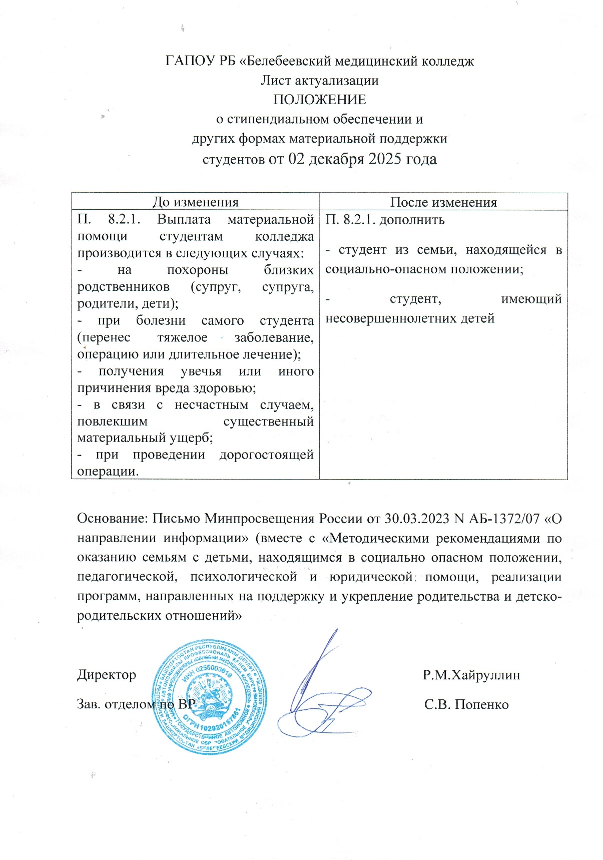 Положение о стипендиальном обеспечении и других формах материальной поддержки студентов